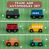 木のぬくもりを感じる列車と車のセットです。列車は磁石で連結、また木製レールの規格は世界共通のため、他社木製レール(40mm)でも遊ぶことができます。
