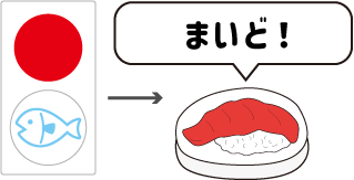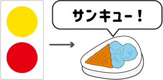 2個のサイコロの目が違う食べ物のときは、出ていない目が示す食べ物をかけ声とともに素早く取るよ!