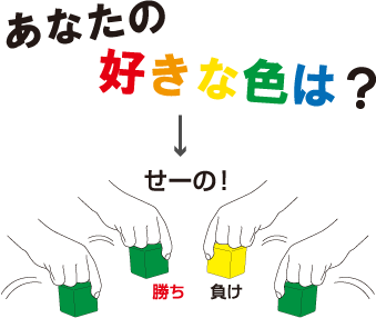 せーのっ!で全員いっせいに決めたブロックを個出して、その場で一番多い色を出している人全員が場からカギをもらえるよ。全員違う色や、引き分けの場合はカギがもらえないよ。